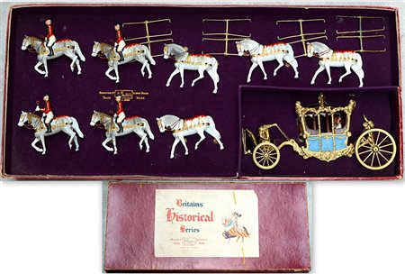 Confezione originale della manifattura W. Britain contenente importante lotto di soldatini in piombo dipinti raffiguranti la carrozza reale inglese con all'interno i sovrani trainata da un tiro ad otto cavalli, di cui quattro montati dai serventi. Oggetto acquistato a Milano negli anni '50 nel negozio Noè