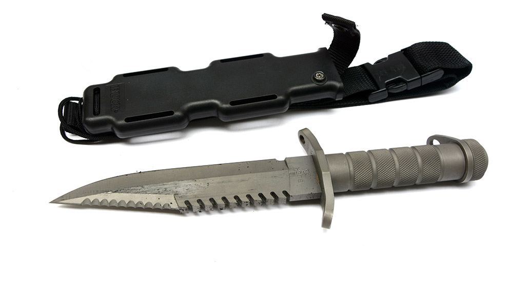 (Historica) Importante coltello da sopravvivenza con custodia, completo di tutti i suoi accessori, marca Buck Kinives (USA). In confezione originale.