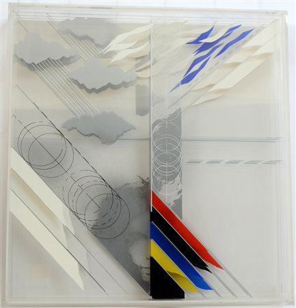Walter Valentini Pergola 1928 "Senza titolo" multiplo in plexiglass multistrato a quattro livelli serigrafati e con collage (cm 49,5x52x7,8). Firmato e numerato 97/99 in basso a destra.
