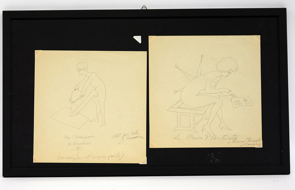 Maccari Mino Siena 1898 Roma 1989 due disegni, matita su carta (cm 21x21 ciascuno) firmati. Con dedica a Franco Russoli. In cornice (lievi difetti)