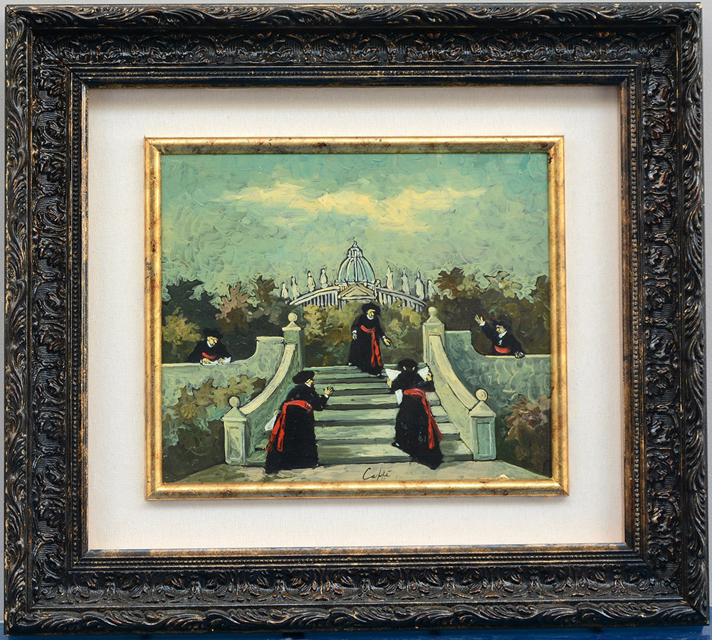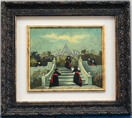 Nino Caffè Alfedena 1909 Pesaro 1975 "Pretini sulla scalinata" 1969, olio su tavola (cm 27x32) firmata in basso al centro. Al retro etichetta firmata dal Dott. Giorgio Borghi. In cornice. Opera accompagnata da certificato di autenticità su fotografia del Dott. Giorgio Borghi (n. archivio 0/2034 OB)