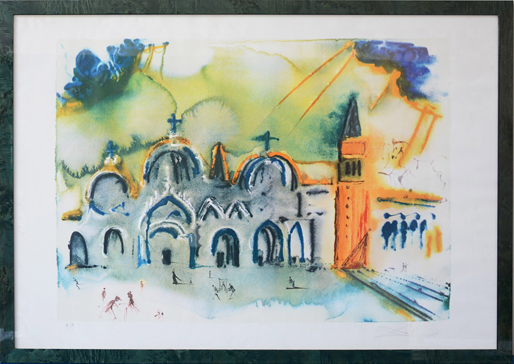 Salvador Dalì. "Piazza San Marco a Venezia" litografia e calcografia a colori (cm 68x98), prova d'artista. Firmata e iscritta in basso a matita. Certificato di autenticità dell' "Art 152" di Parigi. In cornice