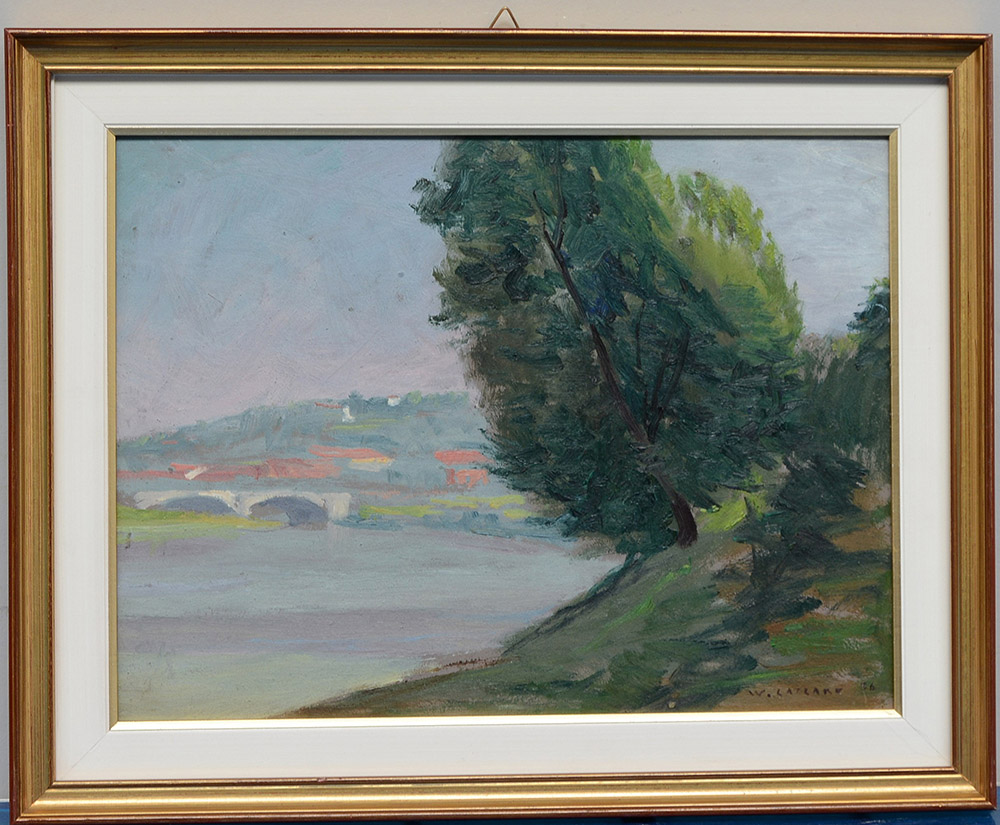 Walter Lazzaro Roma 1914 1989 "Lungo il Po" olio su masonite (cm 30x40) firmato e datato in basso a destra. Etichette al retro della Lazzaro by Corsi Gallery. Autentica su fotografia della figlia Sandra Lazzaro (codice archivio 0103GAZMD). In cornice