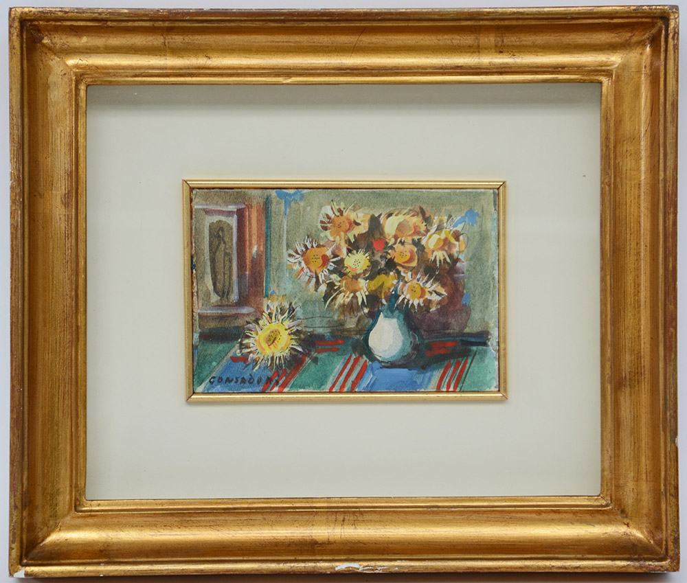 Silvio Consadori Brescia 1909 Burano 1994 "Cardi di Gressoney" 1990, tecnica mista su cartone (cm 10x15) firmato in basso a sinistra. Firmato, datato e inscritto al retro ed etichetta della galleria Ponte Rosso, Milano. Autentica su fototografia della Galleria Ponte Rosso (n. 1/8167 del 13.5.2009). In cornice