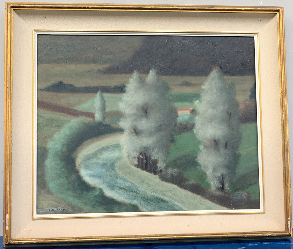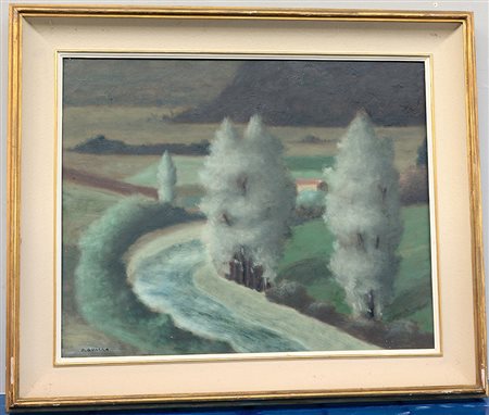 Osvaldo Gualla "Il chiese a Lavenone" olio su compensato (cm 50x60)firmato in basso a sinistra iscritto e datato 1952 al retro. In cornice