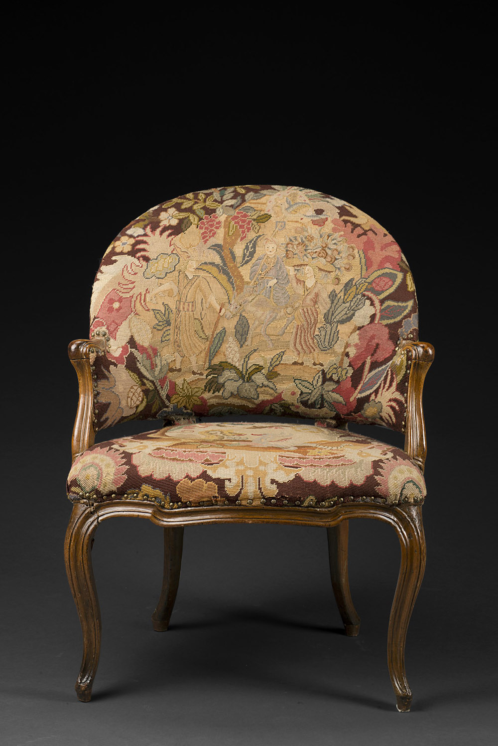 Poltrona "a pozzetto" in noce con braccioli e gambe mossi. Foderata con antico tessuto a piccolo punto. Piemonte, sec. XVIII (restauri) Walnut armchair "a pozzetto". Piedmont, 18th century (restorations)