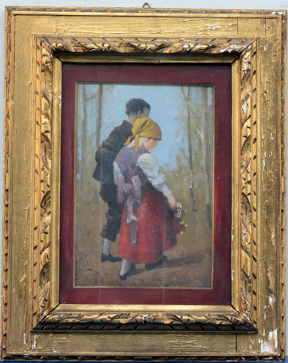 Leoni "Figure popolari", olio su compensato (cm 30x20) firmato in basso a destra, in cornice (difetti)