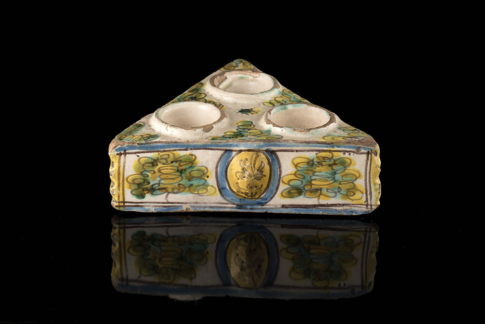 Manifattura di Deruta sec. XVII. Saliera in maiolica (cm 15x5x13) (difetti e mancanze)