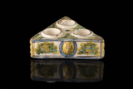 Manifattura di Deruta sec. XVII. Saliera in maiolica (cm 15x5x13) (difetti e...