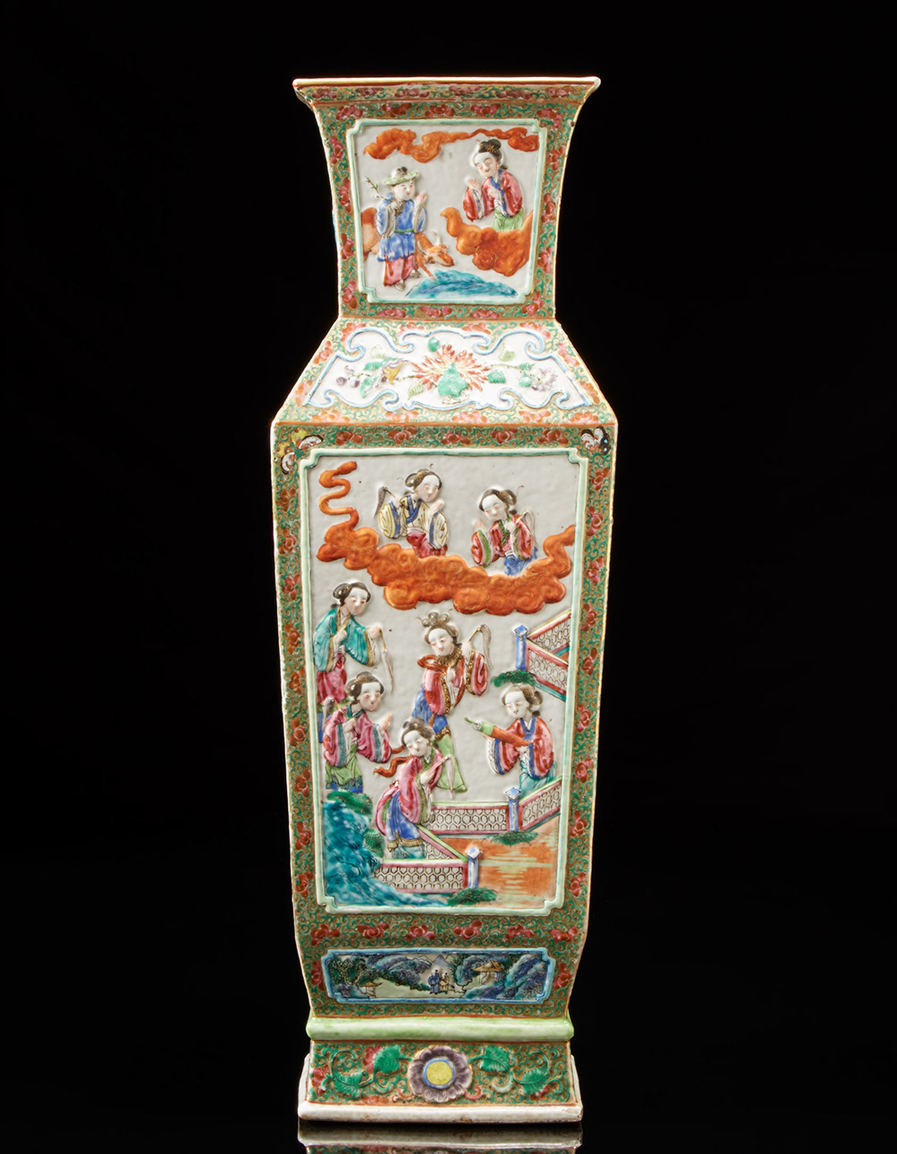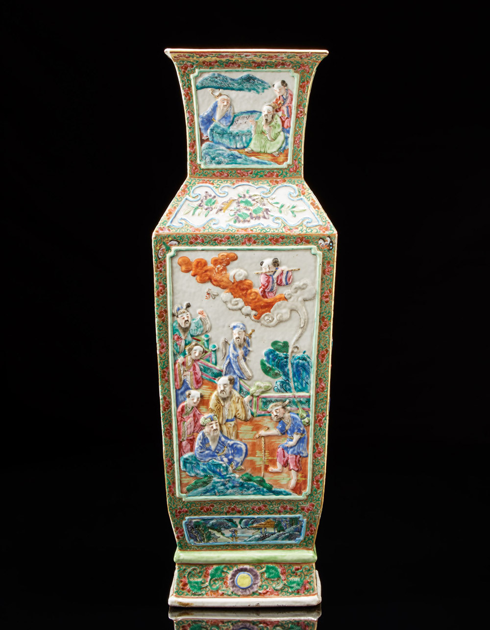 Vaso di forma quadrata in porcellana Famiglia Verde decorato con oggetti preziosi (difetti) Cina, sec. XIX A squared-shaped Famille Verte vase decorated with precious objects (losses) China, 19th century (h. 60 cm.)