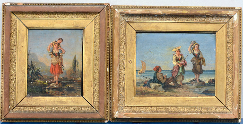 Scuola napoletana, coppia di olii su tavola raffiguranti scene di genere (cm 13x16 e 13,5x11) tracce di firma in basso a sinistra, in cornici (difetti)