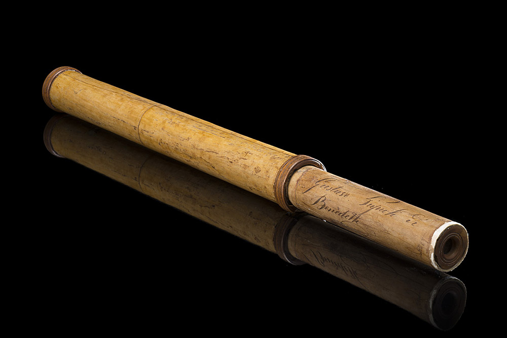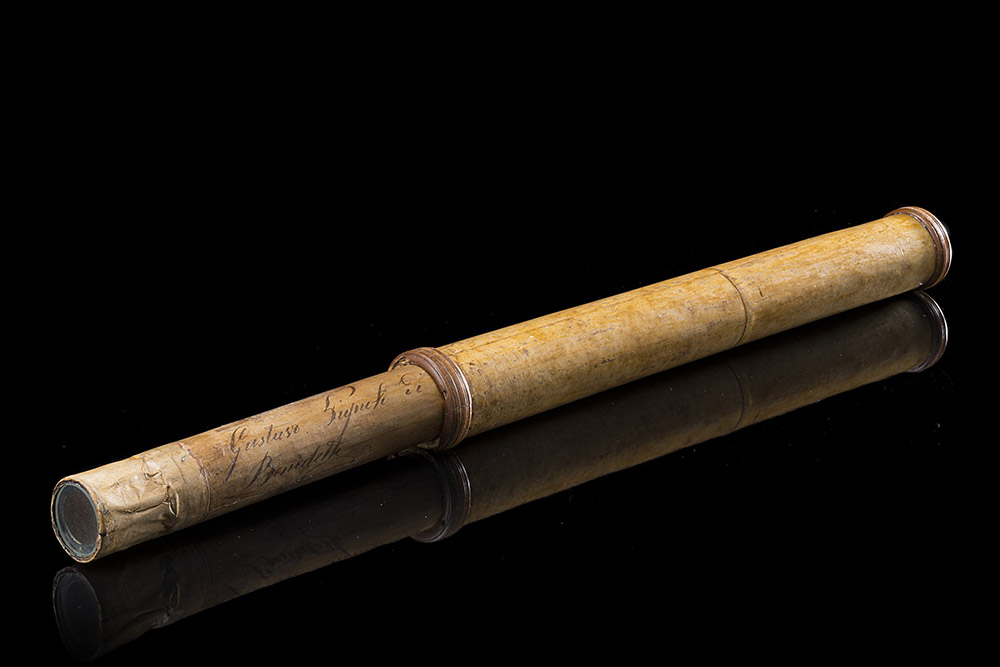 Cannocchiale telescopico in cartone a finto bamboo con ghiere incise. Firma di difficile lettura all'interno "Gustavo Sigiuso(?) Di Benedetti". Sec. XVIII (cm 32, aperto cm 48)(gravi difetti e mancanze) 18th-century cardboard telescope. Hardly legible signature "Gustavo Sigiuso (?) Di Benedetti" (defects and losses)