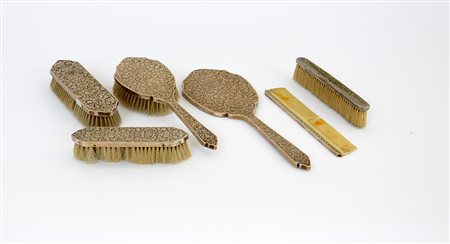 Servizio da toilette in argento inciso con decoro floreale composto da tre spazzole, un pettine, uno specchio a mano e una spazzola in metallo. Italia, metà sec. XX (difetti)