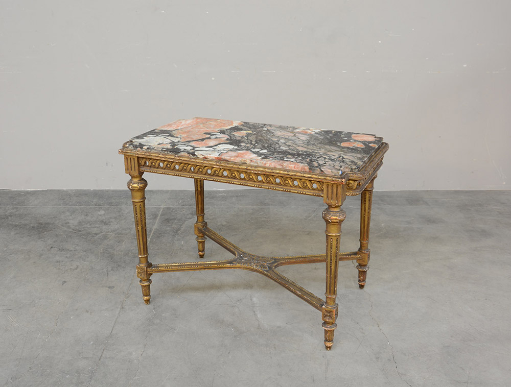 Tavolino da centro in legno intagliato e dorato con gambe riunite da crociera e piano in marmo sagomato (cm 100x72x60) (difetti)