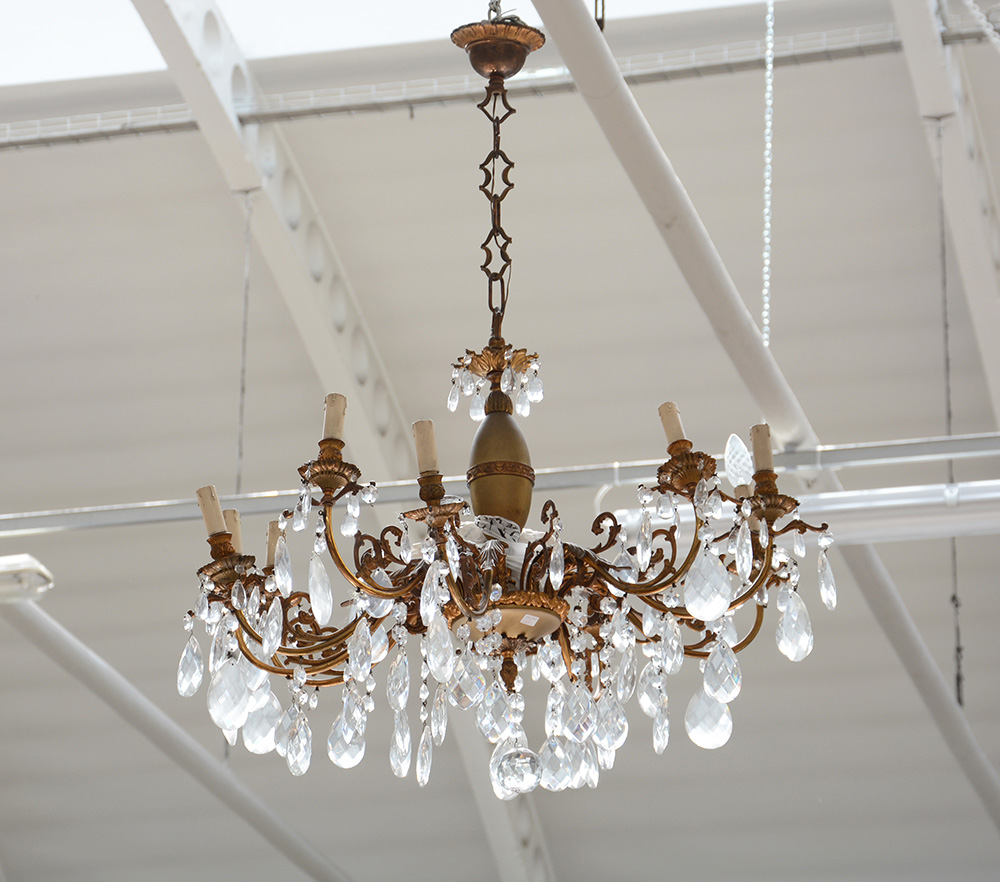 Lampadario a dieci luci con struttura in bronzo e pendagli a goccia in cristallo, anni '60 (d cm 70) (lievi difetti)