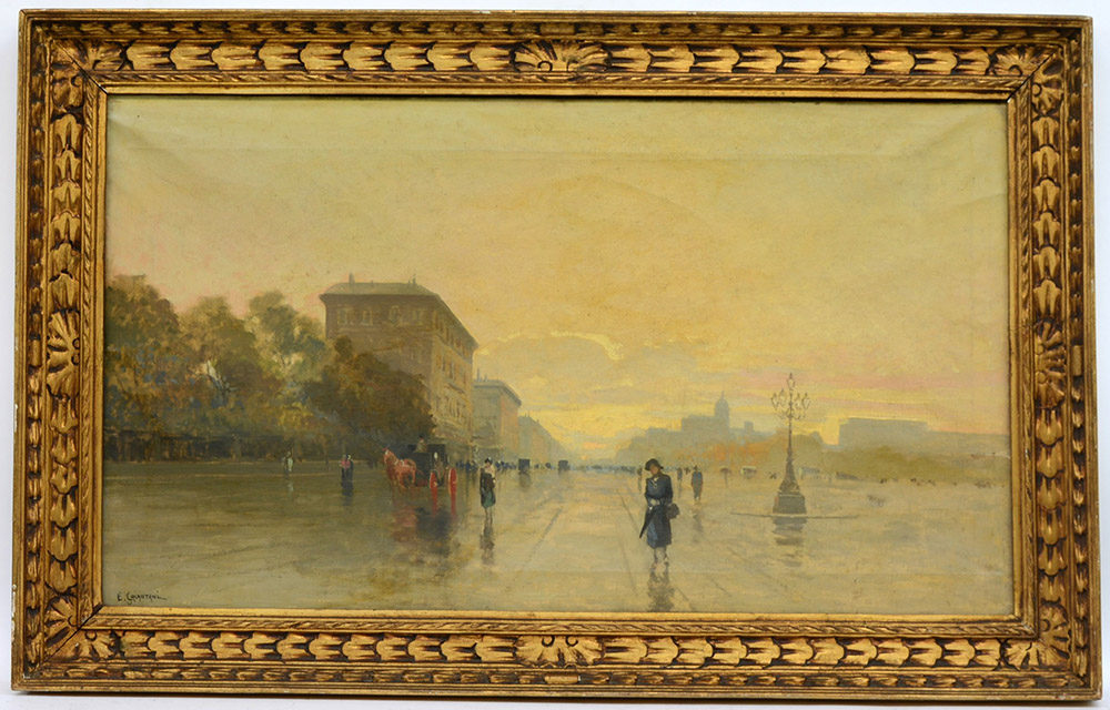 Colantani E. "Scorcio di piazza", olio su tela (cm 57x100) firmato in basso a sinistra, in cornice (difetti)