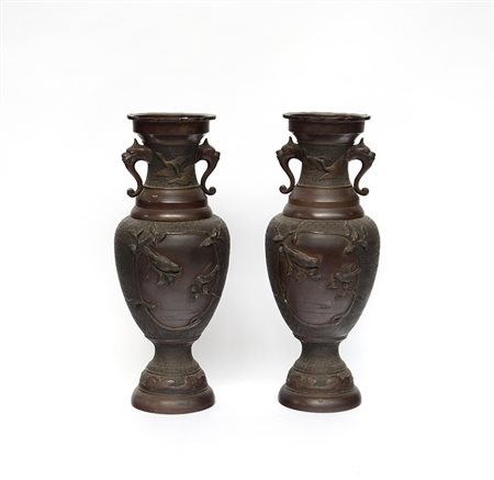 Coppia di vasi biansati in bronzo decorati con coppie di volatili Giappone, sec. XX (h. 58 cm.)