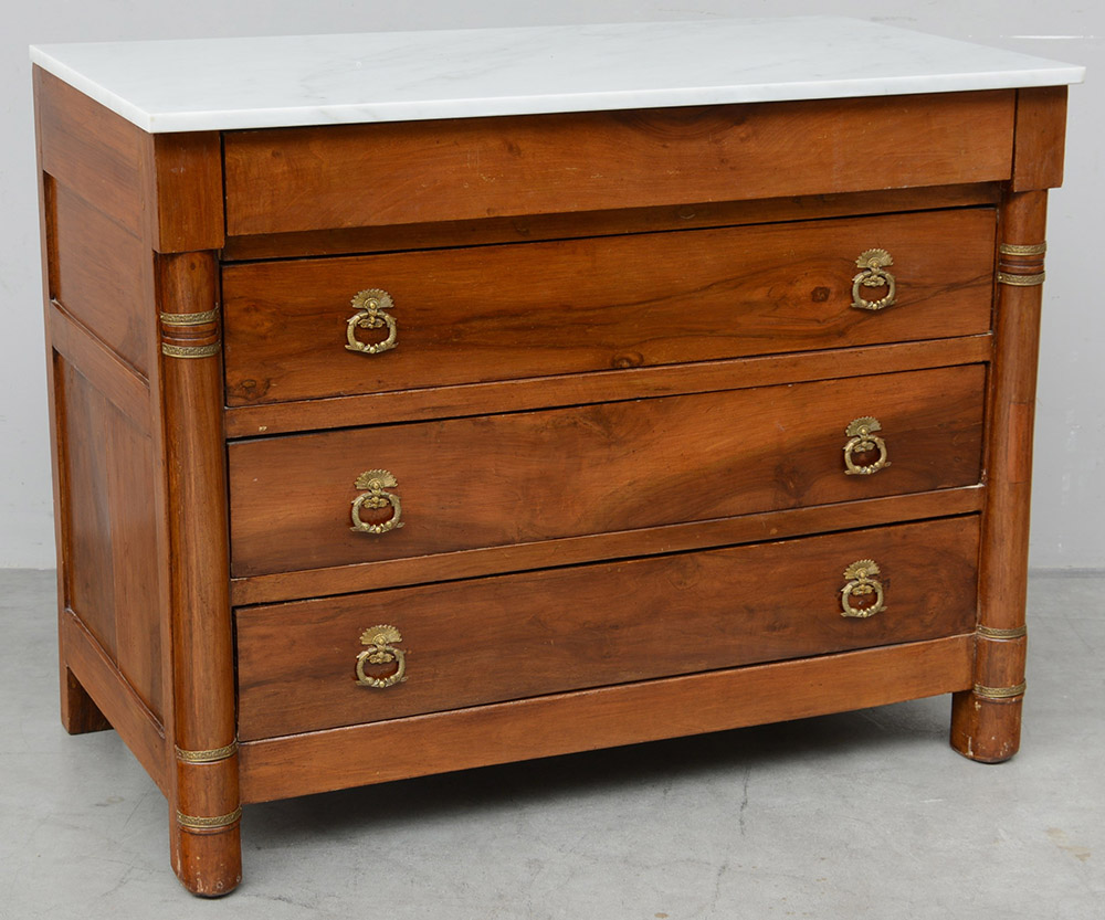 Comò "impero" in noce ad un cassetto sottopiano e tre grandi sul fronte. Montanti a mezza colonna e ferramenta in bronzo dorato. Piano in marmo. Sec XIX (cm 117x93x63) (difetti)