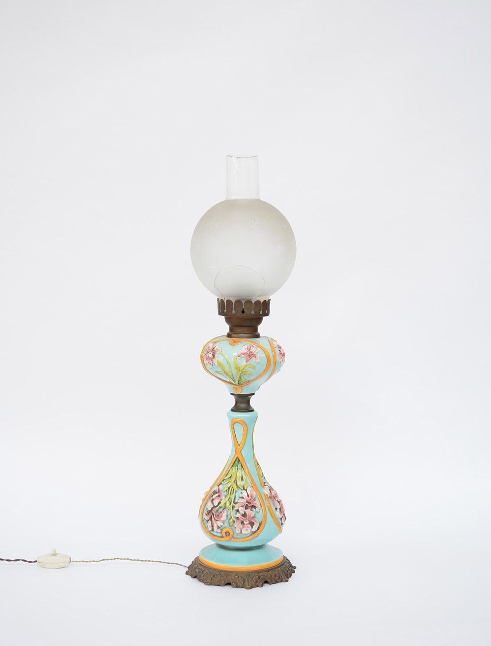 Lampada da tavolo a petrolio in porcellana policroma con elementi in bronzo, montata a luce elettrica (h cm 64)