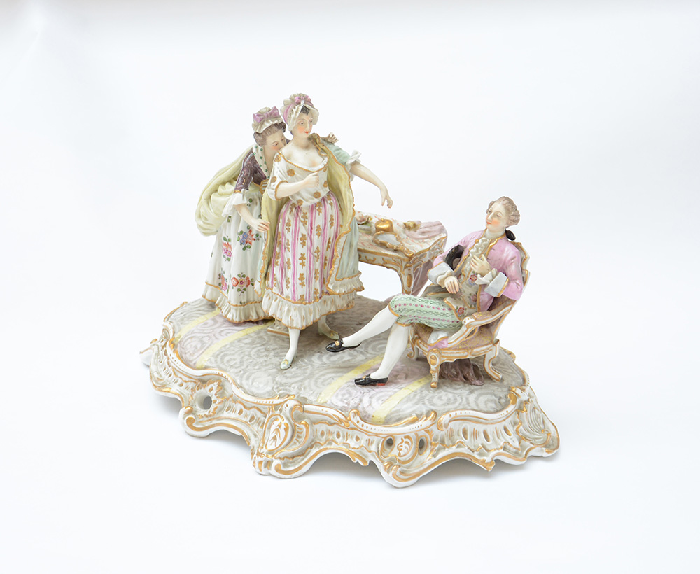 Manifattura di Meissen, gruppo in porcellana policroma con scena galante di...
