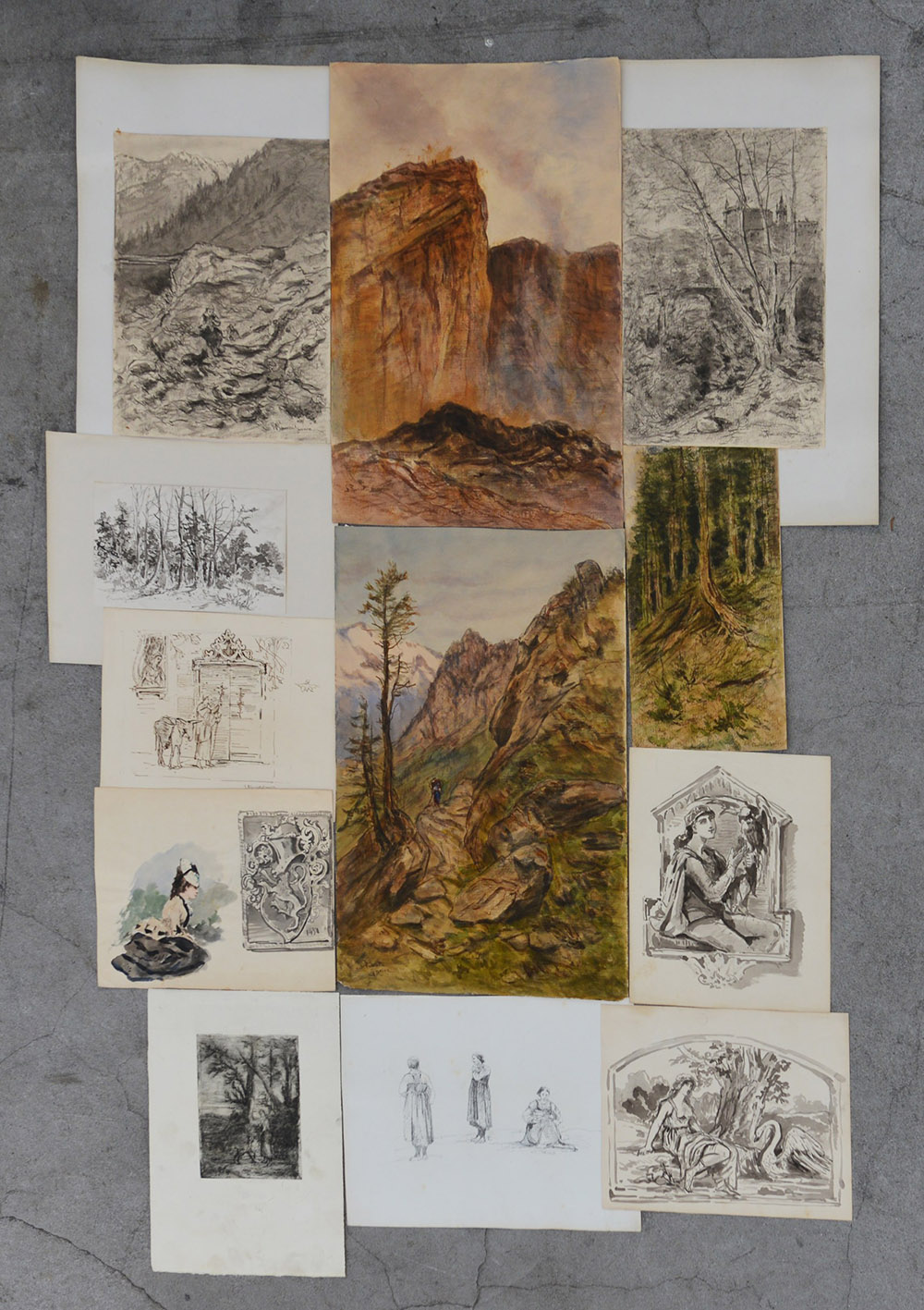 Giuseppe Puricelli Guerra Gallarate 1832 Casirate D'Adda 1894 Cartelletta contenente undici tra disegni, bozzetti, incisioni ed acquarelli per lo più raffiguranti paesaggi, molti firmati (difetti)
