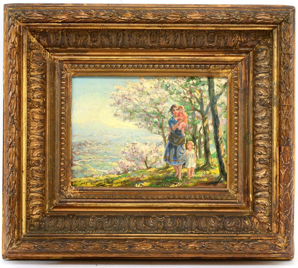 Giuseppe Pennasilico Napoli 1861 Genova 1940 "Passeggiata sulle colline fiorite" olio su tavoletta (cm 15x19.5) Firmato in basso a sinistra. Al retro: tracce di iscrizione. In cornice
