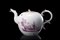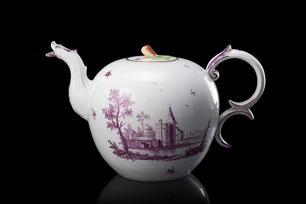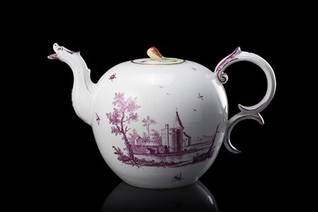 Teiera globulare in porcellana con decoro a paesaggi e rovine architettoniche in monocromia porpora. Ansa a doppia voluta. Versatoio zoomorfo. Marca di fabbrica incussa. Hochst, sec. XVIII (usure allo smalto) Porcelain globular teapot. Hochst, 18th century (defects to enamel)