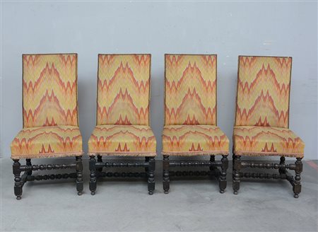 Gruppo di quattro antiche sedie a rocchetto rivestite in tessuto a fiamma...
