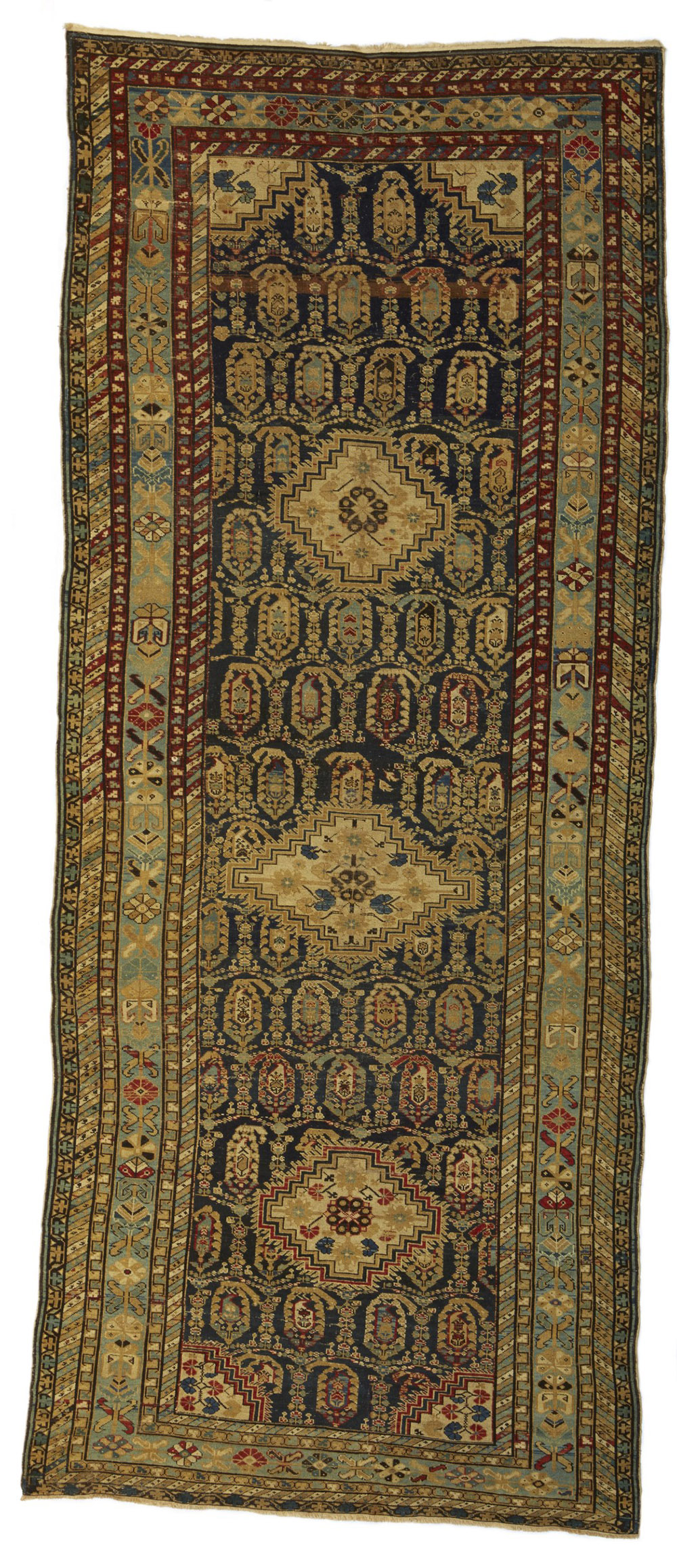 Tappeto Chila, Caucaso sec XIX. Disegno a tre medaglioni su fondo blu, cosparso di file di Boteh (cm 360x145) (difetti, tagliato e ridotto) 19th-century Chila Caucasian carpet (defects, cuts and restorations)