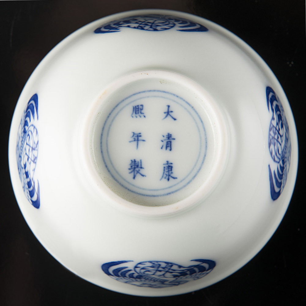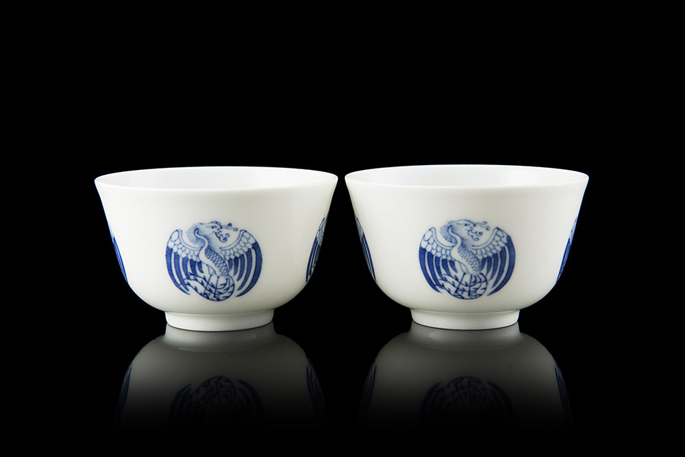 Coppia di coppette in porcellana bianca e blu con decorazione di fenici, con marchio apocrifo Kangxi sul fondo, in scatola originale Cina, sec. XX (h. 7,5 cm.)
