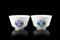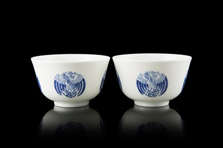 Coppia di coppette in porcellana bianca e blu con decorazione di fenici, con...