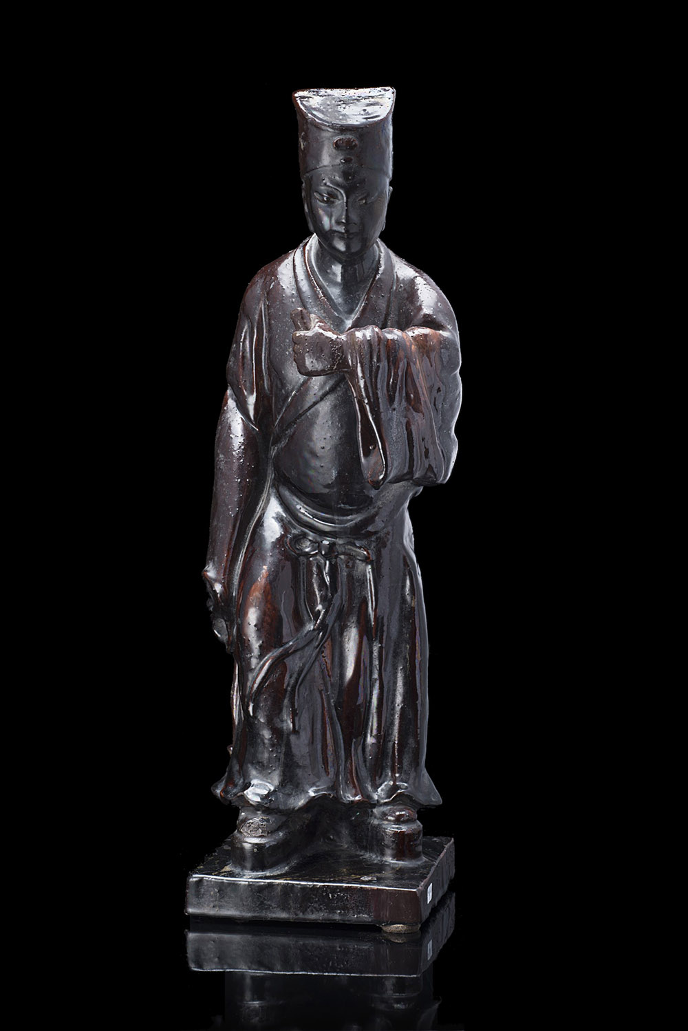 Manifattura della fine del sec. XIX. "Figura di dignitario cinese" scultura in grès a smalto monocromo. Etichetta della Collezione Questa, Torino, al retro (h. cm 53) (difetti)