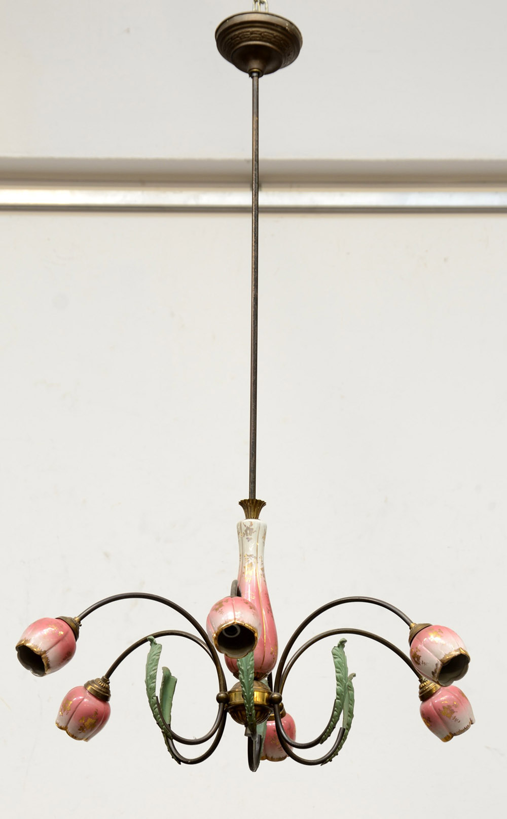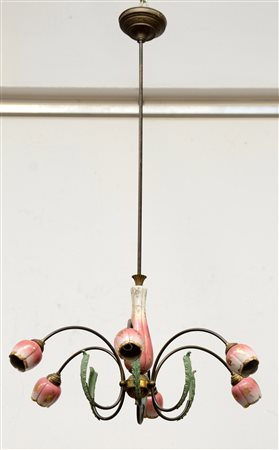 Lampadario a sei luci in metallo e ceramica policroma decorato a foglie e fiori (h. cm 117)