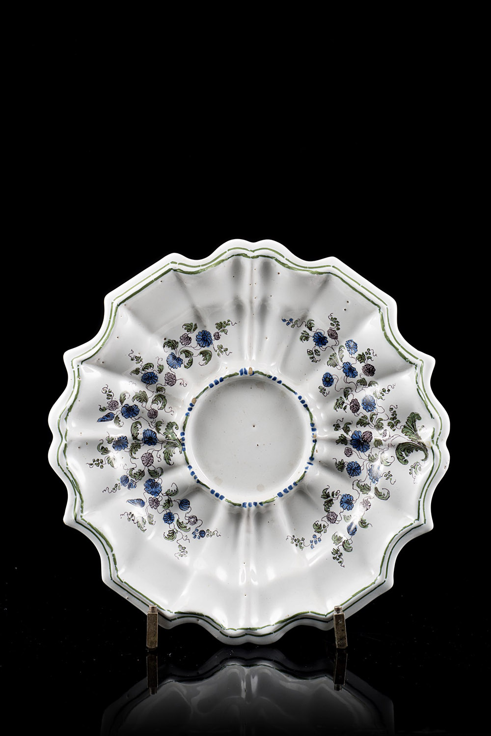 Piatto in maiolica con orlo rialzato mistilineo con forti costolature che terminano in cerchio rialzato che doveva contenere il piede della tazza da brodo. Decorazione a fiori. Bassano, manifattura P. Antonibon, sec. XVIII (d. cm 23,5) (lievi sbeccature)