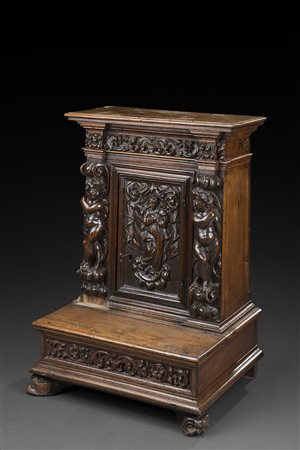 Inginocchiatoio in noce ad un cassetto laterale sottopiano, fronte con fasce intagliate a motivi vegetali e anta scolpita con raffigurazione dell'Assunzione della Vergine. Montanti scolpiti a figure di putti, piedi a delfino. Bergamo, sec. XVII (difetti e restauri)