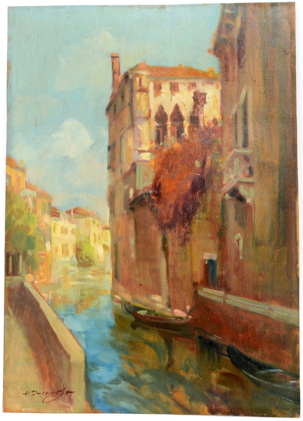 Attilio Achille Bozzato Chioggia 1886 Cremona 1954 "Venezia. Scorcio con gondole" bozzetto ad olio su compensato (cm 70x50) Firmato in basso a sinistra
