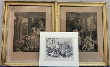 Lotto di due incisioni del sec. XIX raffiguranti scene galanti, montate su telaio (cm 73x56) in cornici, a cui si unisceuna stampa con scena di battaglia (difetti)