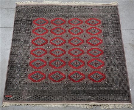 Tappeto Bhukara, Pakistan sec. XX. Disegno a Gul rossi con piccoli medaglioni. Firma in basso a sinistra (cm 186x185) (difetti)