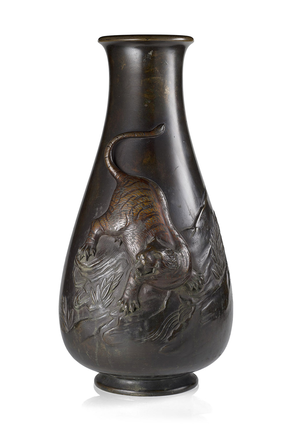 Vaso in bronzo decorato con tigre in rilievo, firmato alla base Giappone, periodo Meiji (1868-1912) (h. 37,5 cm.)