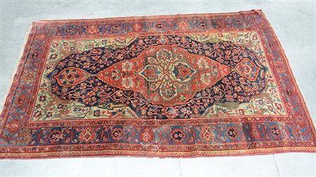 Tappeto Ferahkan. Persia, inizio sec. XX. Disegno a medaglione rosso su fondo blu. Decorazione floreale in policromia, elegante bordura Herati su fondo azzurro (cm 198x124) (difetti e mancanze)