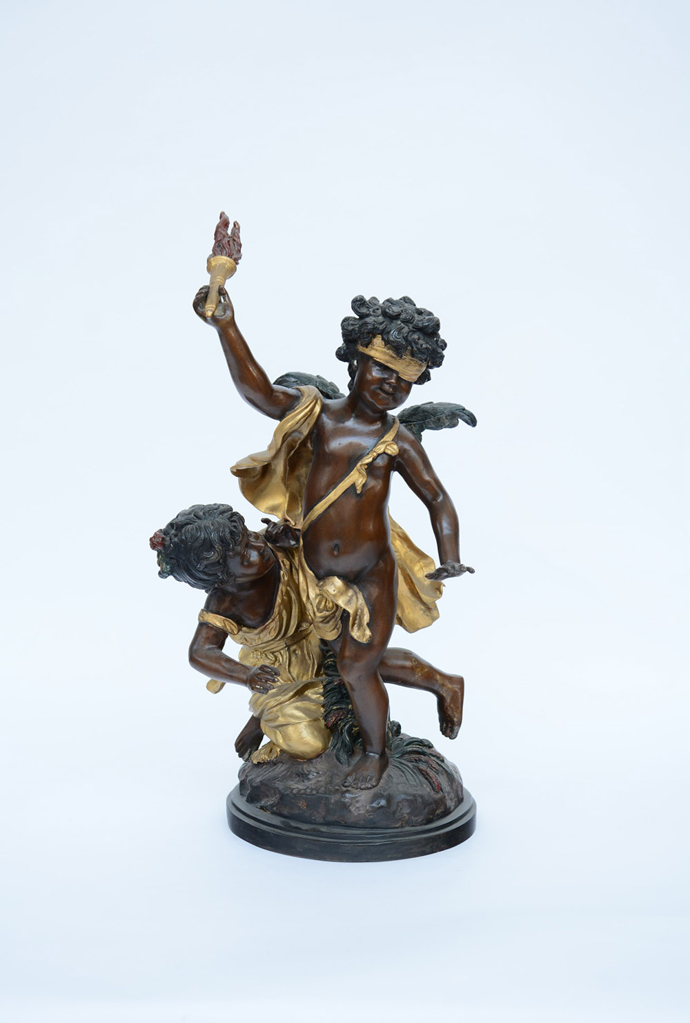 Gruppo scultoreo in bronzo brunito e dorato raffigurante una coppia di amorini giocosi (h cm 55) (lievi difetti)