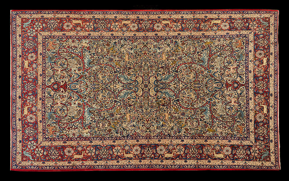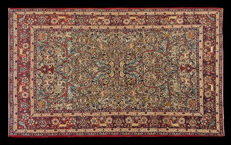Tappeto Sarouk, Persia secolo XX. Disegno a vasi con animali su fondo bianco (cm 310x200) (difetti)