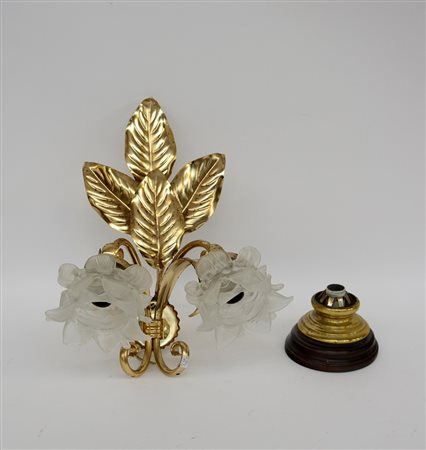 Lotto composto da un'applique a due fiamme e una ad una fiamma in legno, metallo e vetro
