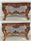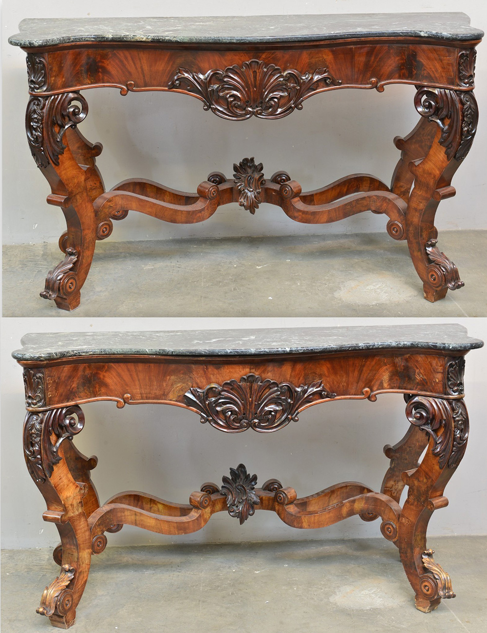 Coppia di consolle in noce di forma mossa con gambe intagliate riunite da traversa, sec. XIX (cm 160x95x51) (difetti)