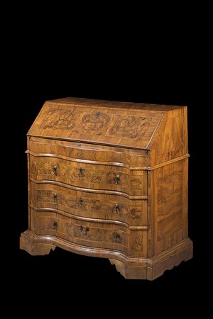 Mobile ribalta lastronato in noce e radica con anta celante vani e cassettini, fronte mosso a tre cassetti, piedi a mensola. Veneto, sec XVIII (cm 104x109x60) (restauri)