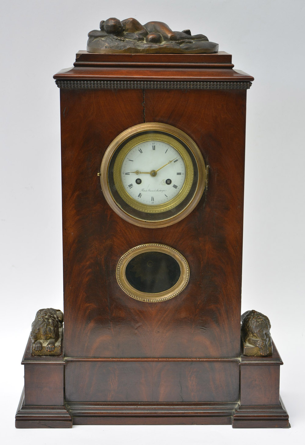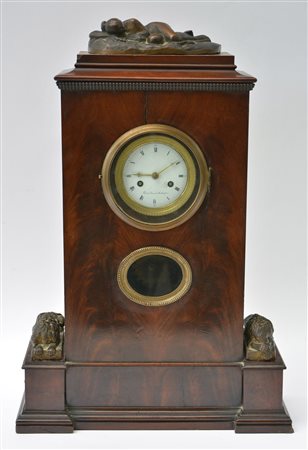Orologio da appoggio con cassa in mogano di forma architettonica sormontata da figura femminile sdraiata in bronzo e ai lati da leoni accovacciati in gesso dorato. Quadrante in smalto con numeri romani marcato Fluteau baron a Montargia. XIX Secolo (h cm 58) (meccanica non pertinente) (difetti)
