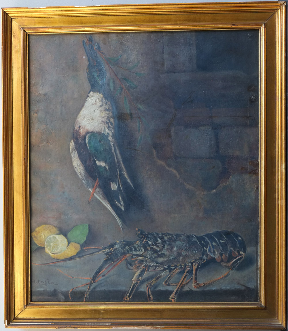 Oreste Costa Firenze 1851 1901 "Composizione con aragosta, limone e anatra" olio su tela (cm 70x60) Firmato in basso a sinistra. In cornice (difetti)
