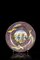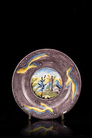 Piatto tondo a bordo liscio in maiolica con ampia bordura a spugnatura in...