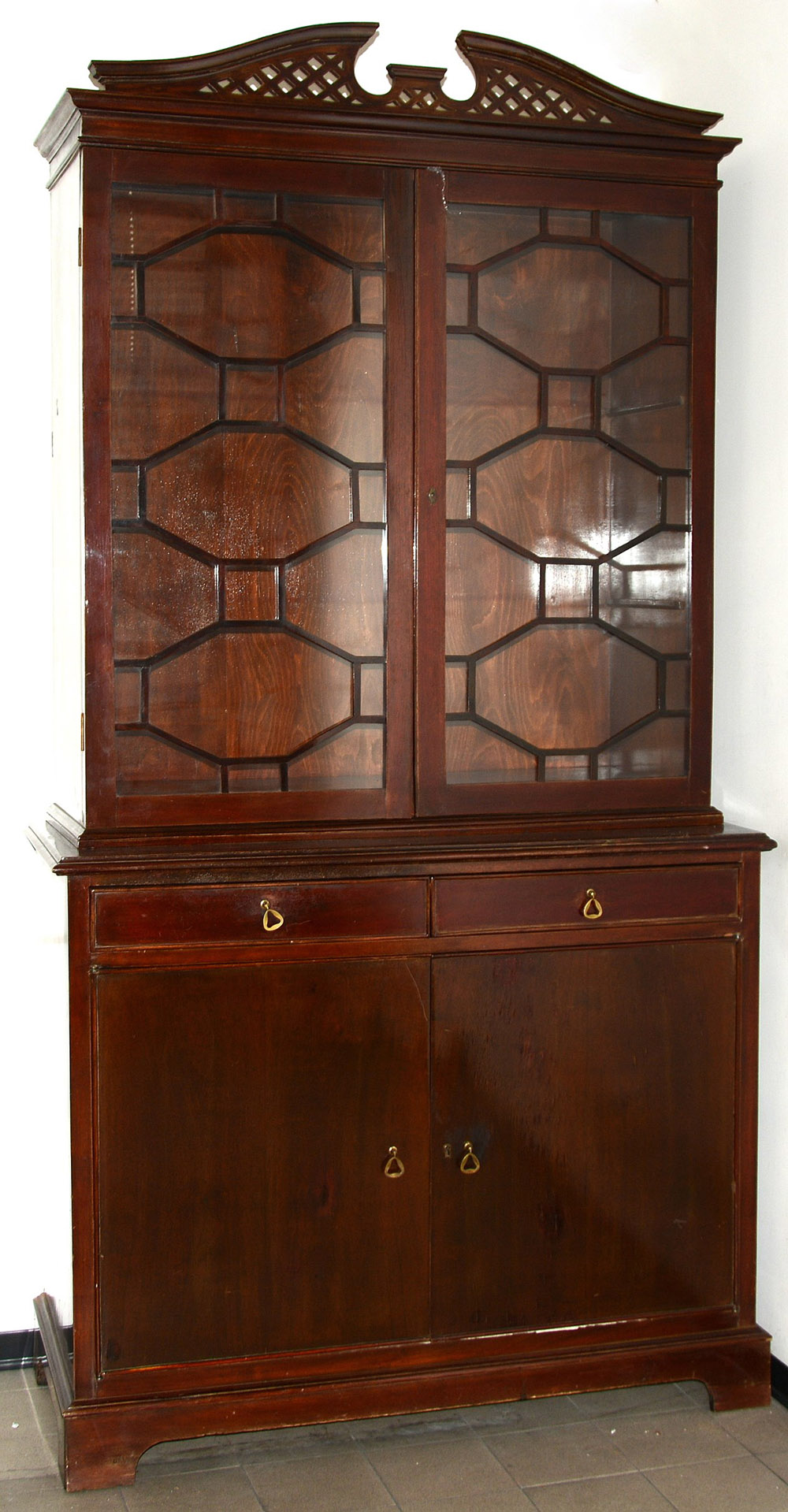 Libreria con parte superiore a due ante a vetri e parte inferiore a due cassetti e due ante (cm 120x230x50)
