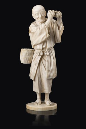 Okimono in avorio raffigurante contadino con cesta di frutta, su base ovale (mancanze) Giappone, periodo Meiji (1868-1912) (h.19,5 cm.)